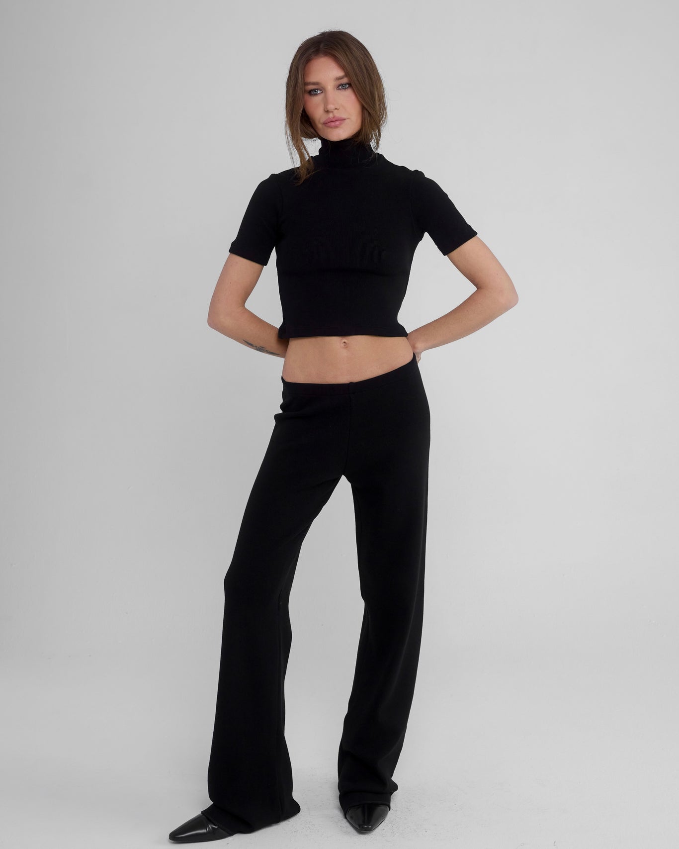 A straight leg rib pant with a low rise that sits right on the hip. Crafted in a thick sculpting cotton rib that feels like a sweater but wears like a sleek trouser. Clean front. No outer seam. Long, minimal, and quietly sexy.