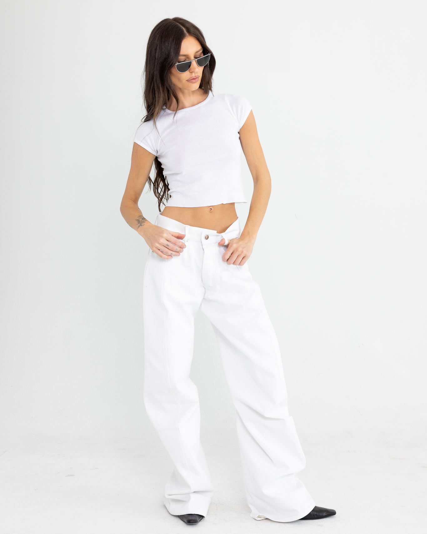 A heavyweight bull denim in crisp white. Structured at first. Softening with wear. The kind of denim that earns its shape over time and becomes yours. Mid rise that sits perfectly on the hip. A relaxed, masculine cut that elongates the leg for a feminine feel. A subtle twisted leg that creates that long, slouchy, effortless drape.